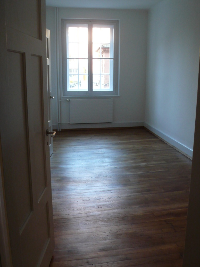In Rheinnähe, 72 m2 grosse 3-ZWG im 1. OG zu vermieten, Gang und Zimmer mit geöltem Riemenparket, WC und Bad getrennt, Küche mit Gasherd, kleiner Balkon, Kellerabteil und Waschküche im Keller