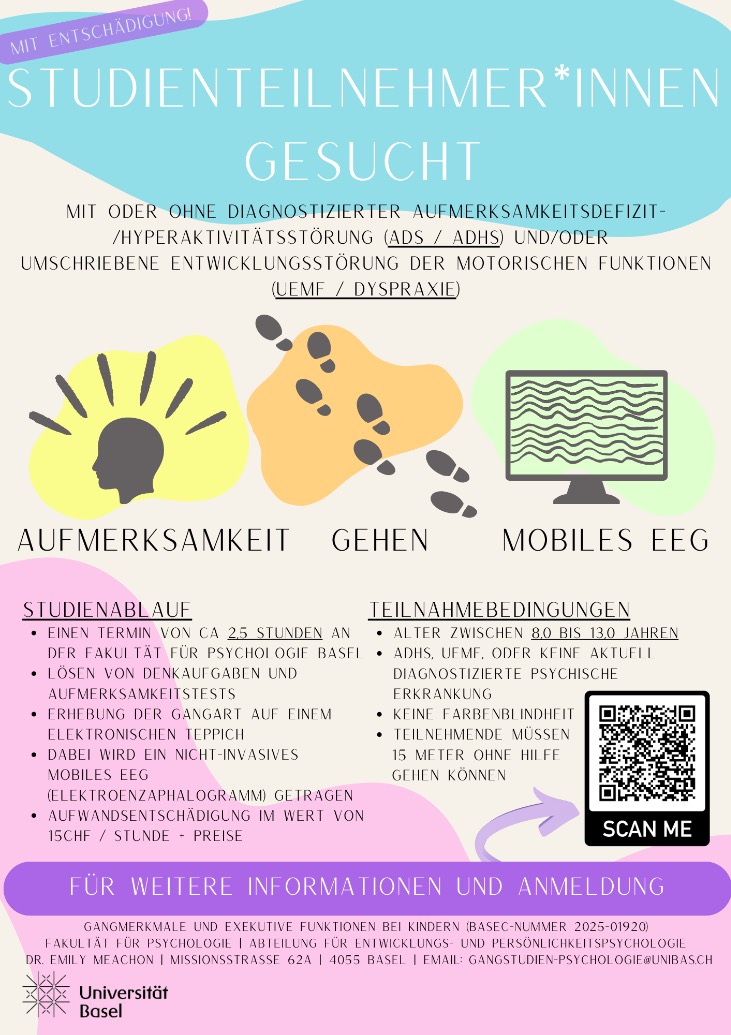 Wir von der Universität Basel suchen derzeit Teilnehmer und Teilnehmerinnen für unsere neue Studie, mit der wir die neuronalen Grundlagen von Inhibition bei Kindern (8-12J) mit und ohne Aufmersamkeitsdefizit- / Hyperaktivitätsstörung (ADS / ADHS) und umschriebene Entwicklungsstörung der motorischen Funktionen (UEMF / Dyspraxie) untersuchen. Die Teilnehmenden werden kognitive Aufgaben lösen und dabei auf einem Teppich laufen, die mit Sensoren ausgestattet ist, um die Gangart zu erfassen. Während der Aufgaben wird zudem ein mobiles EEG getragen.